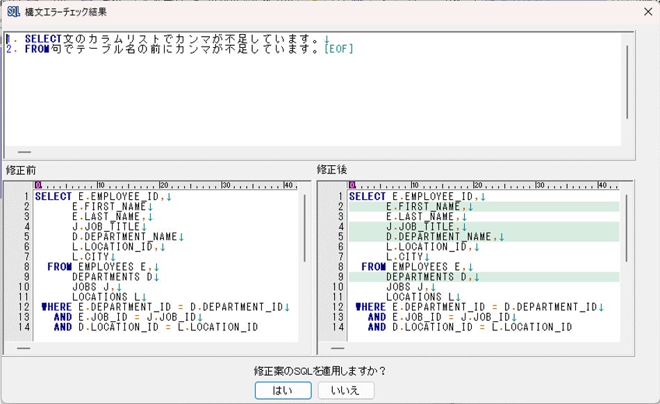 AIによる構文エラーチェック機能にて、修正前、修正後のSQLを表示するように改善しました。差分のある行がハイライト表示されるため、修正箇所を確認した上でSQLの自動訂正を行うことができます。