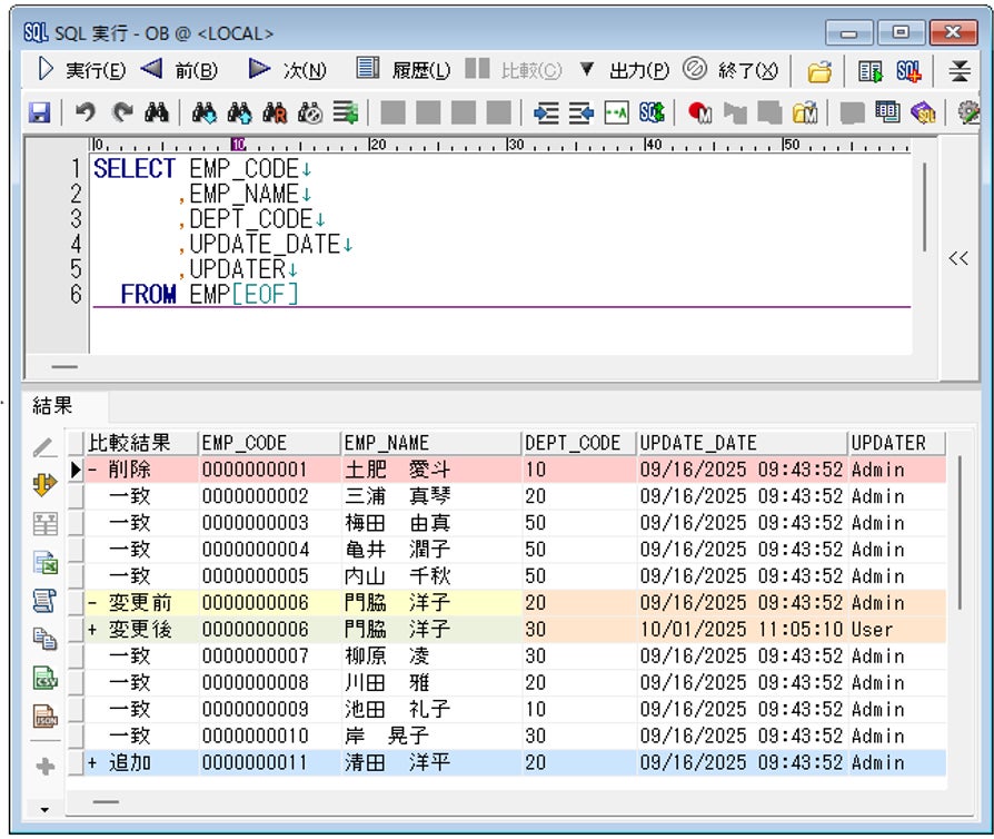 テーブルデータの差分を表示できる機能を追加しました。SQL実行画面にてSELECT文を2回実行することで、前回のSELECT実行結果との差分を調査できます。追加や削除、更新されたレコードはハイライト表示され、即座に差分のレコードが特定できます。