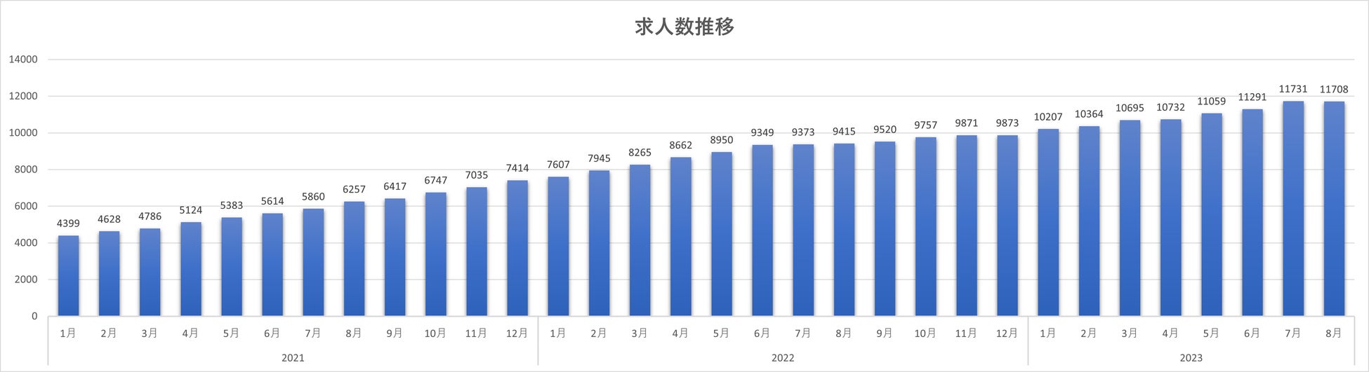 下図は、メーカー・製造業に特化した求人を取り扱うタイズの2021年1月~2023年8月の各月の求人数推移です。2021年1月より右肩上がりに増加し続け、2023年8月末時点では2021年1月比2.5倍以上という結果となり、過去最高水準となっております。