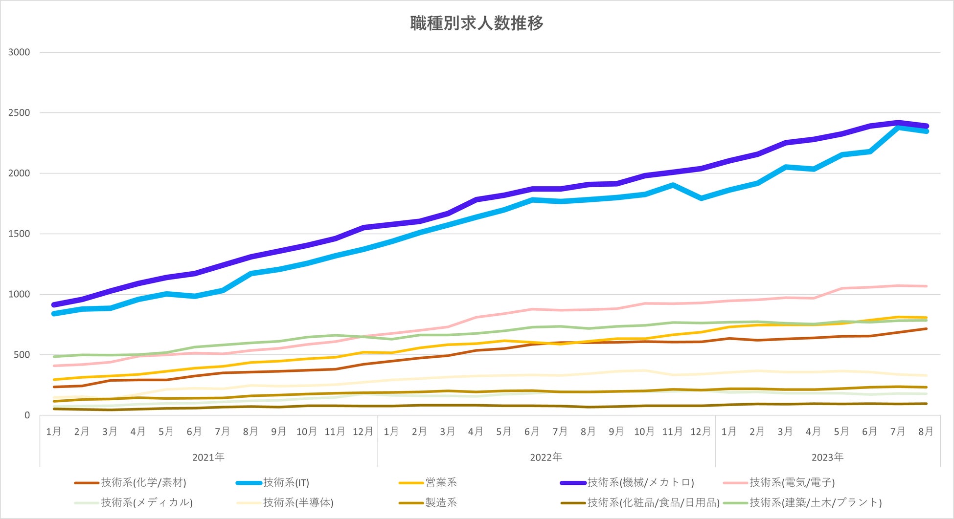 下図は、タイズにおける2021年1月~2023年8月各月の職種別求人数推移です。タイズ全体の求人数推移増加にあたり各職種別求人推移も右肩上がりに増加し続けている中、対象期間による求人数伸び率については機械系技術職、IT系技術職の2種が上位となっており、2023年8月時点では2021年1月時点と比べ約2.5倍となっています。