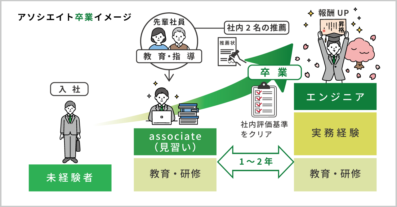 チームメンバーから「一人前」と認定されることがアソシエイト社員の卒業条件です。”卒業”にあたっては社内の1名以上の推薦者と推薦状の承認者1名の計2名の同僚の承諾・推薦が必要となります。