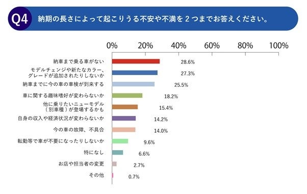 納期が長いということは、その間の車生活をどう過ごすかも大きな問題です。そのため「納車まで乗る車がない(28.6%)」や「今の車の車検が到来する(25.5%)」、「今の車の故障、不具合(14.0%)」は切実な問題といえるでしょう。