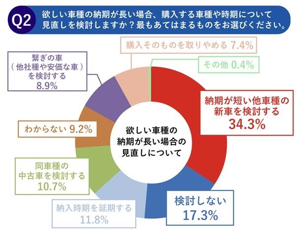 購入予定車種の納期が長い場合、「他車種の新車を検討する(34.3%)」が最も多い結果となりました。「繋ぎの車を検討する(8.9%)」と合わせると、43.2%の方が『他車種を検討する』ということ。