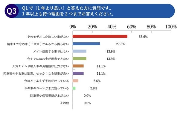 納期1年以上という非常に長い期間でも待てる理由は、やはり「そのモデルしか欲しい車がない(55.6%)」からと答えた方が最多。その車種に強いこだわりや欲しいという気持ちがあれば、長い納期も問題にはならないようです。