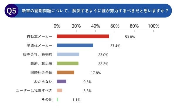 つまり、2/3以上の方が「コロナ禍だから仕方ない。長く待とう」とは考えていないということがいえるのではないでしょうか。それは質問『新車の納期問題の解決について、誰が努力するべきか』で、『ユーザーが我慢すべき』が5.3%と少数であったことからも明らかです。