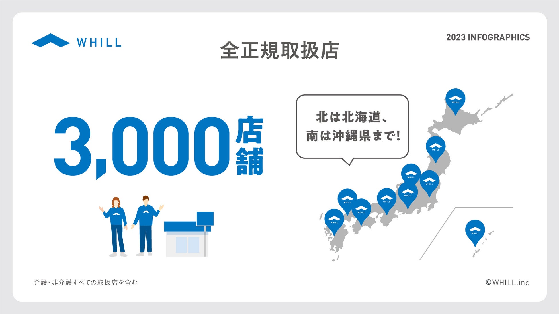 近距離モビリティWHILL(ウィル)の取扱店舗総数(介護/非介護チャネル含む)は全国約3,000店舗に増え、うち自動車ディーラーに限ると非介護チャネルの開拓を本格化させた2020年から1,300店舗に拡大しました。