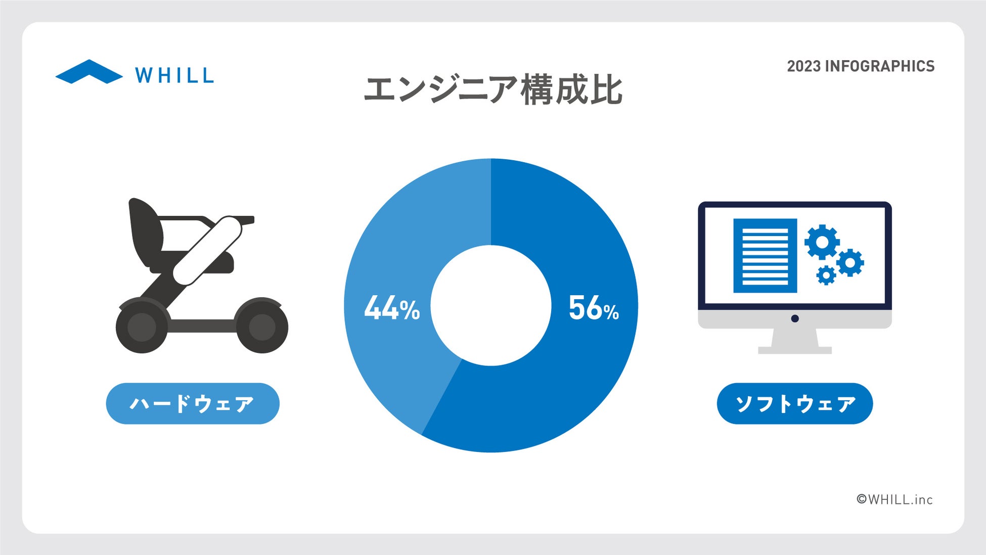 グローバルでのエンジニア構成比はソフトウェアが半数以上を占めます。モビリティ販売に限らず、ソフトウェア開発を通じてモビリティサービスやより快適なWHILLライフ提供に向けて取り組んでいます。