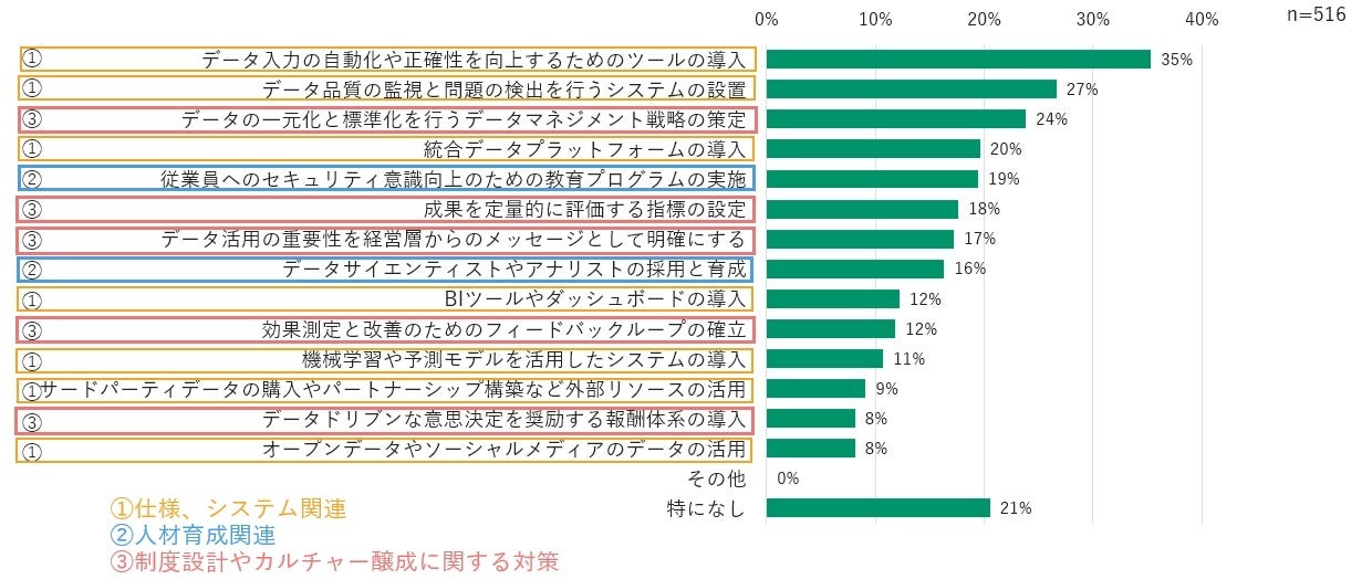 前問の「データ数量の不足」「データが管理が一元化されていない」「デジタル化できていない」といった課題に対応するように専用ツールやシステムの導入に注力したいという回答が上位になった。「データ入力に関するツール導入」がトップとなったが、3位には「データマネジメント戦略の策定」が入っており、ツールの導入だけでなくマネジメントについても重要性が認識されていることがわかる。