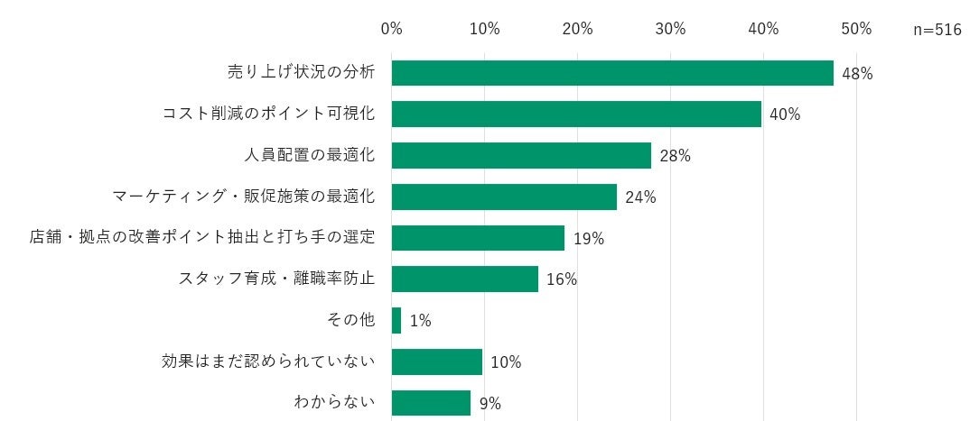 売上の分析やコスト削減のポイントを可視化する点で効果が認められたという回答が上位になった。その下には最適化や打ち手の選定といった項目が上がっているが、Q9のデータ活用レベルで「必要なデータの可視化」が過半数を占めたことから、対策を考案し施策に落とし込むところまで進んでいる企業はまだ少数と考えられる。