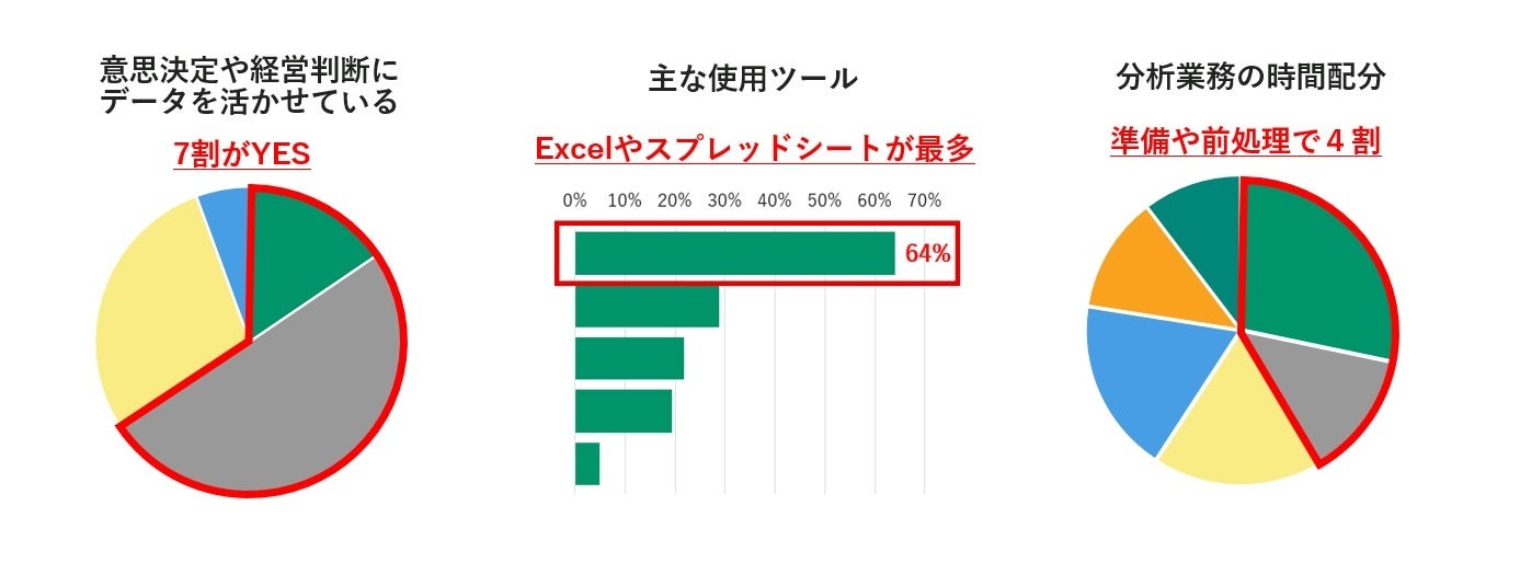 約7割が「意思決定にデータを活用できている」と回答する一方、未来予測や施策考案の仕組みまでできているのは約2割。BIなどの専用ツール利用は少数にとどまりExcelなどの表計算ソフトが中心