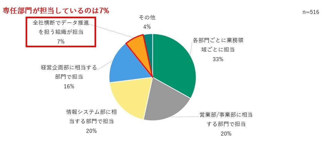各部門ごと、事業部ごとのようにデータに関連する部門で個別に集計や分析を行っていることが多く、全社横断で専用部門が担当していると回答したのはわずか7%と、ほとんどの場合は個別の部門で必要なデータを各々が集計、分析していることがわかった。