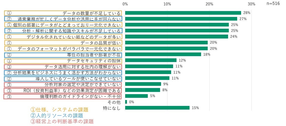 上位の回答は「データの数量が不足している」「一元化ができていない」「紙のままでデジタル化されていない」という仕様やシステムの問題と、「忙しく手が回らない」「スキル不足」など人的リソースの問題に大きく二分化される。それ以外にも「社内の理解不足」「効果測定が困難」など、経営における重要性の判断において課題があることがわかる。