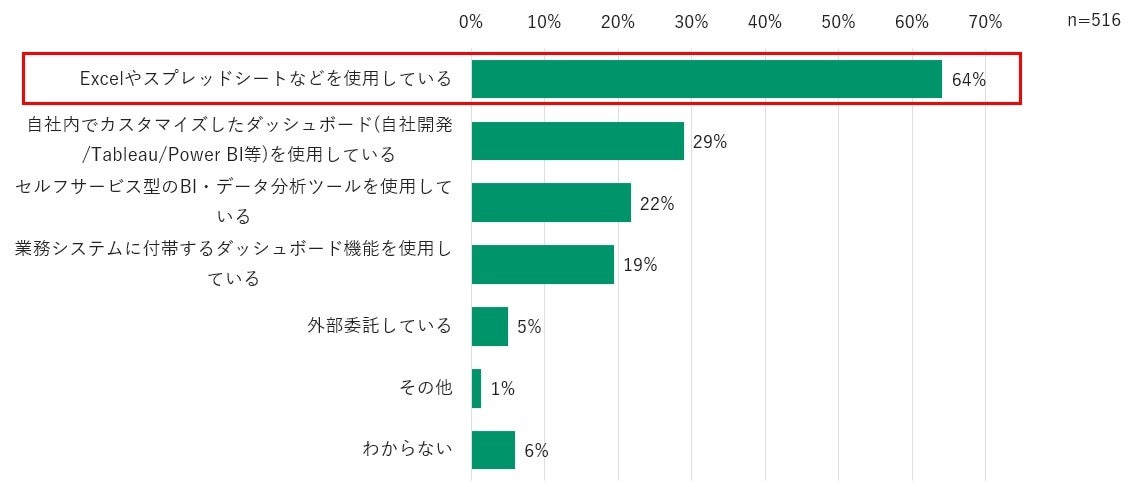 Excelやスプレッドシートの利用がトップ。ダッシュボード等の専用ツールを利用しているのは少数派と言える。予算や人員などの都合による理由を除けば、専用ツールを利用するためには、データ活用の目的が明確に定まっており、かつ統一されたフォーマットで定期的に出力できるような環境を整える必要があるため、そのような下準備がなくともデータ統合が可能でフレキシブルに変更や修正ができる表計算ツールが多用されている可能性も考えられる。