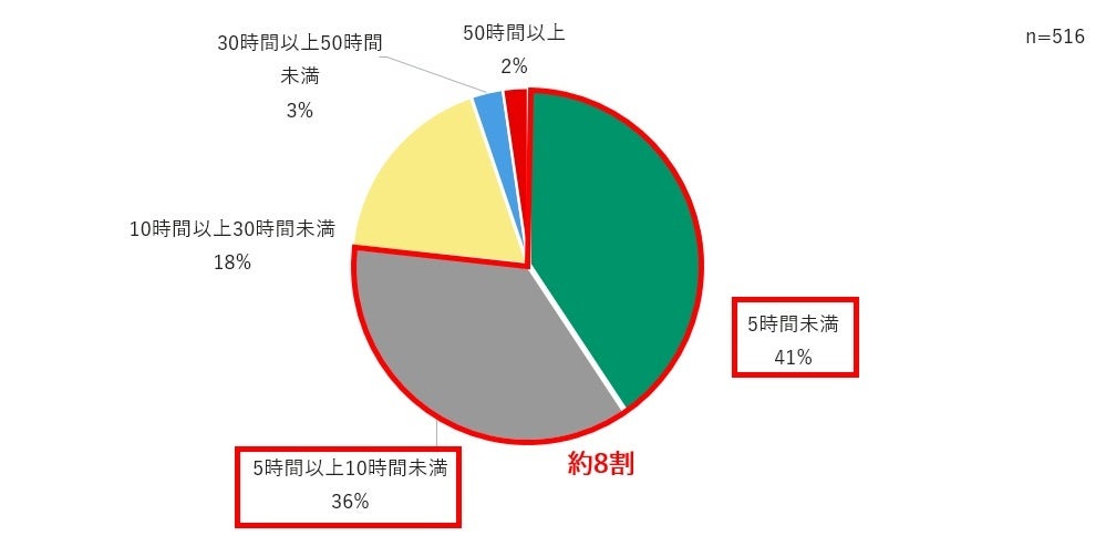 5時間未満が4割、10時間未満を合わせると約8割となり、多くの担当者が定型化したプロンプトやフォーマット等により繰り返しの作業を効率化して進めていると考えられる。