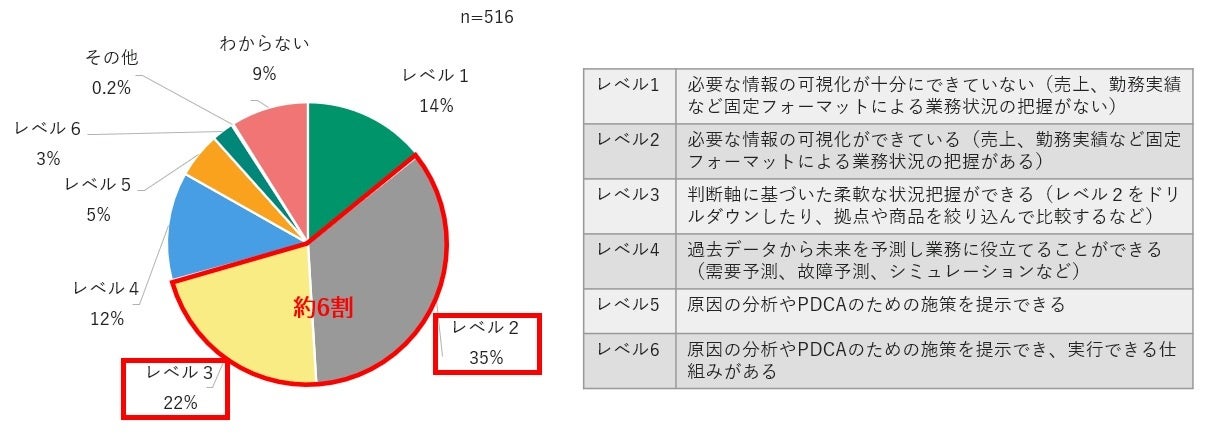 レベル2「固定フォーマットによる定期的な可視化」、レベル3「レベル2のドリルダウンや絞り込み」で約6割を占めた。個別の要素が定期的に可視化され、目前の課題解決のための数値や情報を追うところまでカバーされているが、未来を予測したり施策考案に至るまでの仕組み化ができている企業は少数であることがうかがえる。