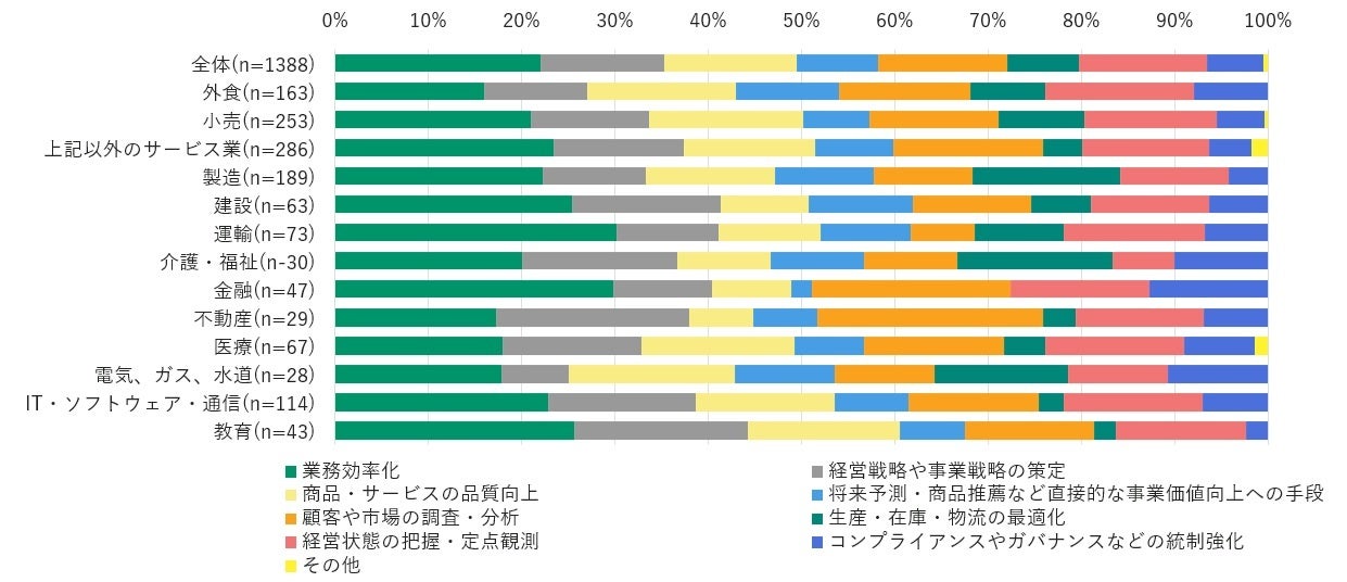 業務効率化を主軸に、売上や利益を上げるための「攻め」の施策考案からコンプライアンスやガバナンス統制などの「守り」に相当する多様な方向性でデータが活用されている。