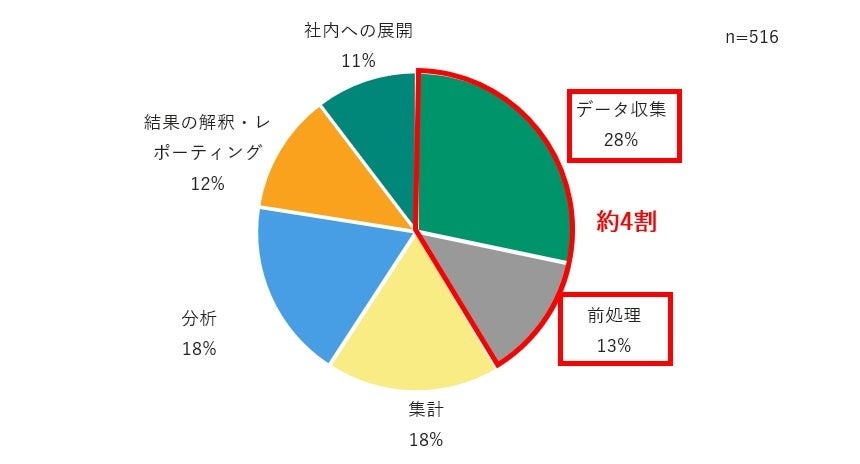データ収集と前処理で約4割と、必要な業務に入るまでの作業に多くの時間が使われているという結果になった。Q12で課題として上げられた「一元化されていない」「品質が低い」「デジタル化されていない」等の解消に時間を割いていると考えられる。
