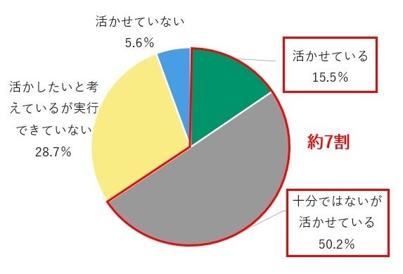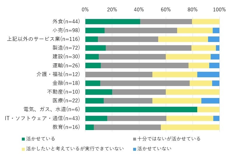 十分ではなくとも約7割が活かせていると回答。業種別にみるとバラツキがみられるものの、「活かせていない」という回答は医療と介護を除けば1割以下にとどまっている。扱うデータの種類や業種の特性とも関連するが、蓄積したデータは課題がありながらも運用されていることがわかる。