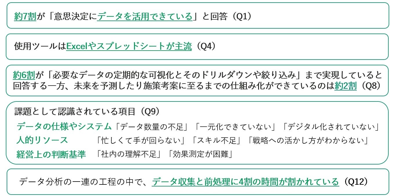 今回の調査では、データの質や取り扱い方、分析リソースなどの面で様々な課題を抱えつつ、業務効率化や戦略立案に向けてデータ活用を試みる企業の姿が浮き彫りとなった。その中でも特に目立った課題を抜粋して考察した。