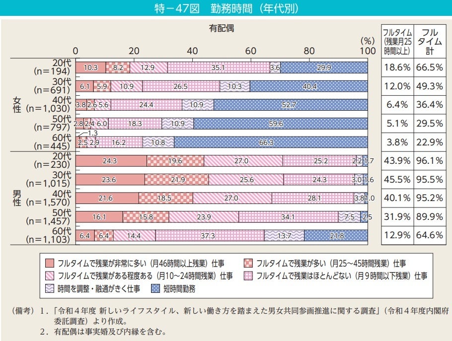 有配偶の男性の長時間労働は、令和5年度の男女共同参画白書でもデータが発表されています。