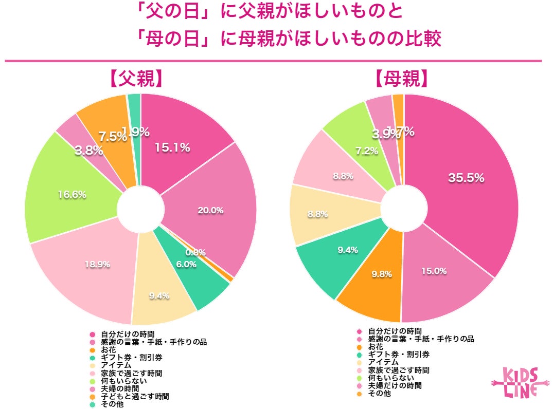 「自分だけの時間」は父親15.1%に対し母親35.5%と、母親に対して父親の回答数が少なくなっています。また「家族みんなで過ごす時間」は父親18.9%に対し母親は8.8%で、10.1%ほど父親の回答が多くなりました。