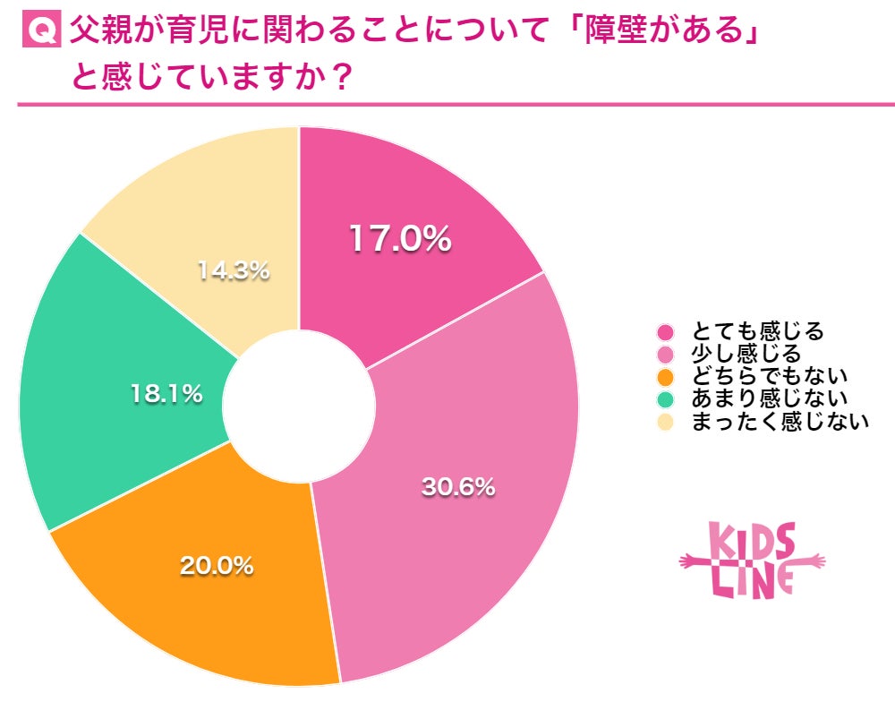 上記に加えて今回は、「父親が育児に関わることについて『障壁がある』と感じているか」についても調査。その結果、「とても感じる」が17%、「少し感じる」が30.6%で合計は47.6%。父親の約半数弱が「育児に障壁を感じる」と回答しました。