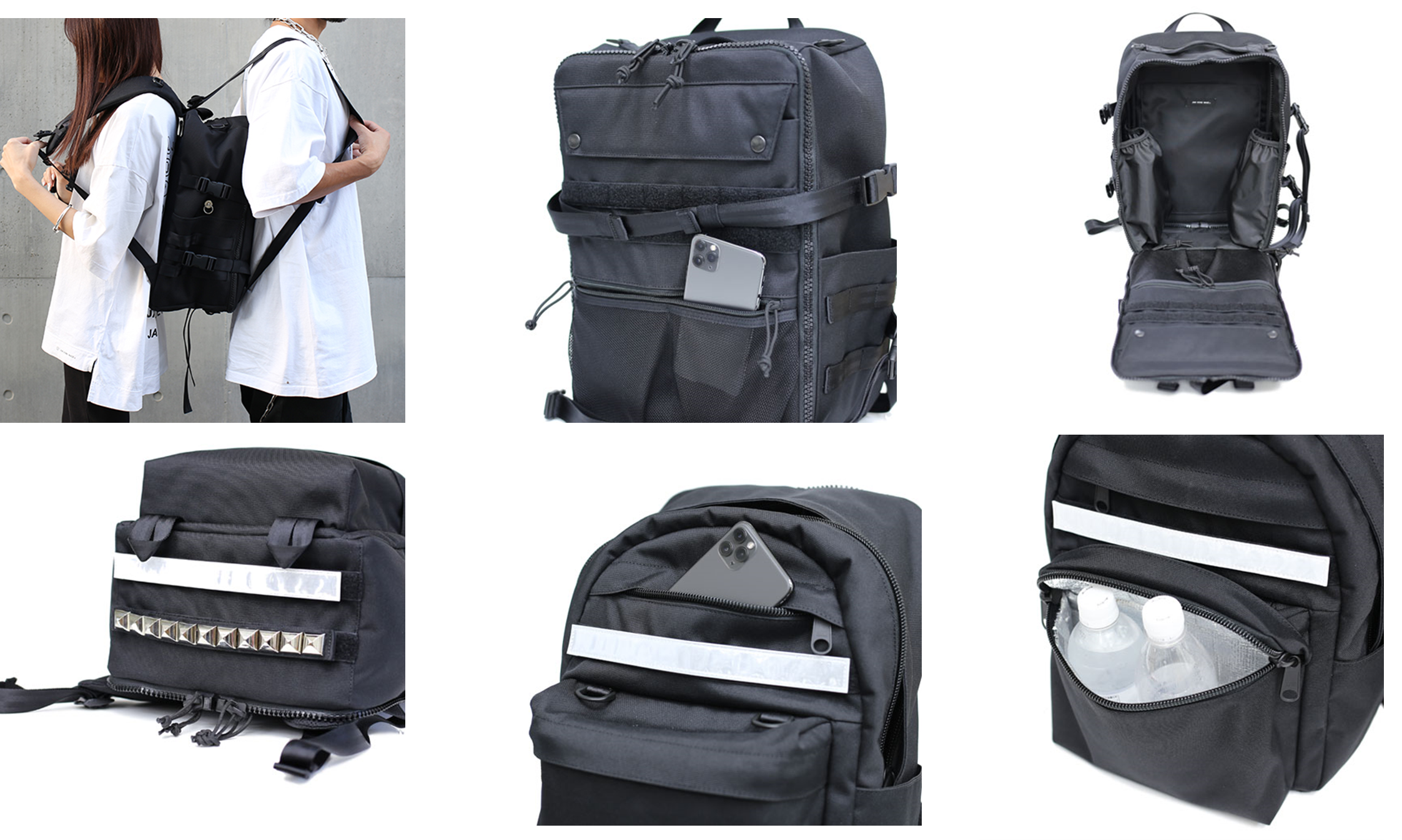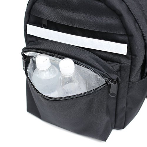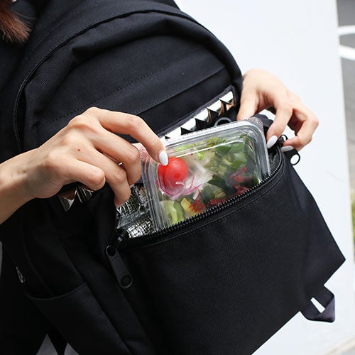 デイパックタイプは、保温・保冷機能素材を用いたフロントポケットで食べ物や飲み物の温度を保てるほか、フロントにデザインされたスタッズを取り外し、リフレクターへ変更することができます。さらに、このたびの2型は、スクエアタイプの前身頃を取り外すことでデイパックタイプとの合体が可能で、2型を1つのバッグとすることで、容量を増やすことは勿論、仕切りのあるバッグとして荷物を仕分けることができるなど、使用する人やシーンに応じた様々な使い方を叶えます。