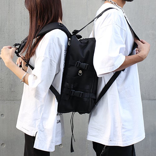 スクエアタイプは、ショルダーベルトを両面に取り付け、ふたりで両面から背負えるほか、取り外しタイプの表身頃はリバーシブルで使用でき、取り外し可能なナイロンテープを取り付けることで、単独での使用も可能。PCやタブレットだけを身軽に持ち運ぶ際に便利なナップサックタイプに様変わりします。