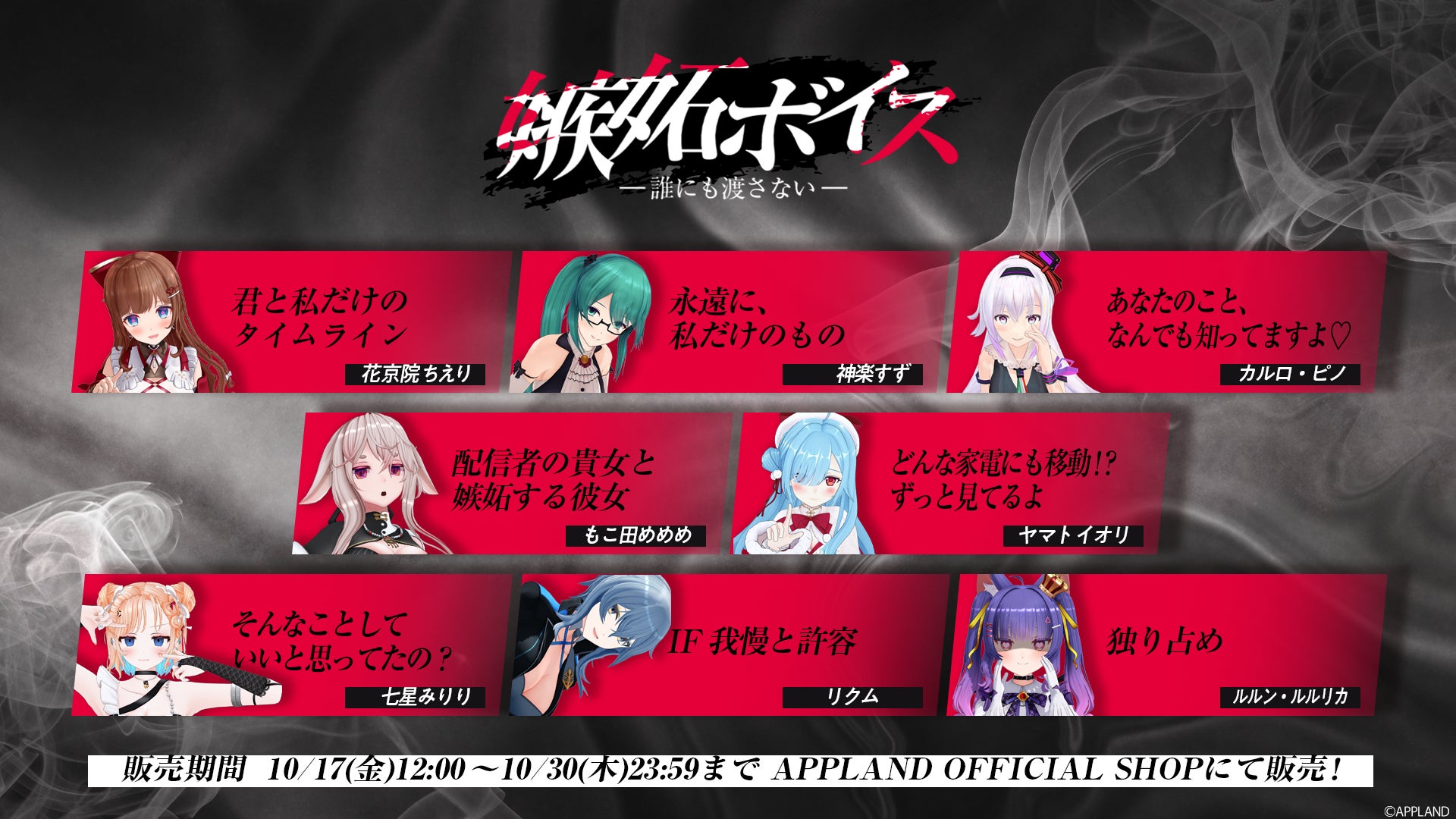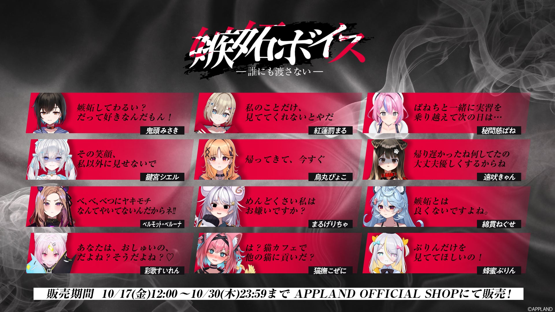 アップランド所属「.LIVE」・「ぶいぱい」メンバーによるバイノーラルボイスを2025年10月17日(金)より販売いたします!『嫉妬と独占欲が絡み合う、危うい恋の物語』をテーマに、.LIVEメンバーとぶいぱいメンバーそれぞれが考案した、嫉妬に関するシチュエーションが楽しめるボイスコンテンツです。是非お楽しみください!