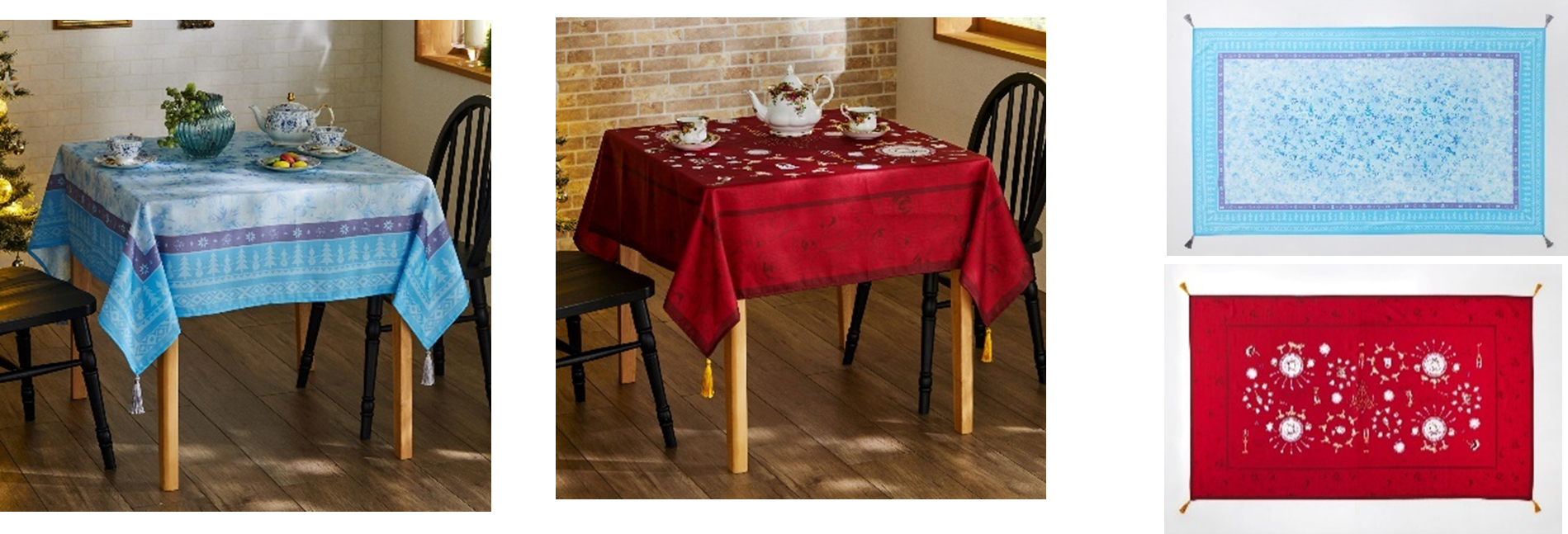 今回発売するのは、『アナと雪の女王』『美女と野獣』をモチーフにした「フリンジ付きテーブルクロス」、「光沢糸刺繍入りクリスマスタペストリー」、そして「ワンピース風エプロン」の3点です。