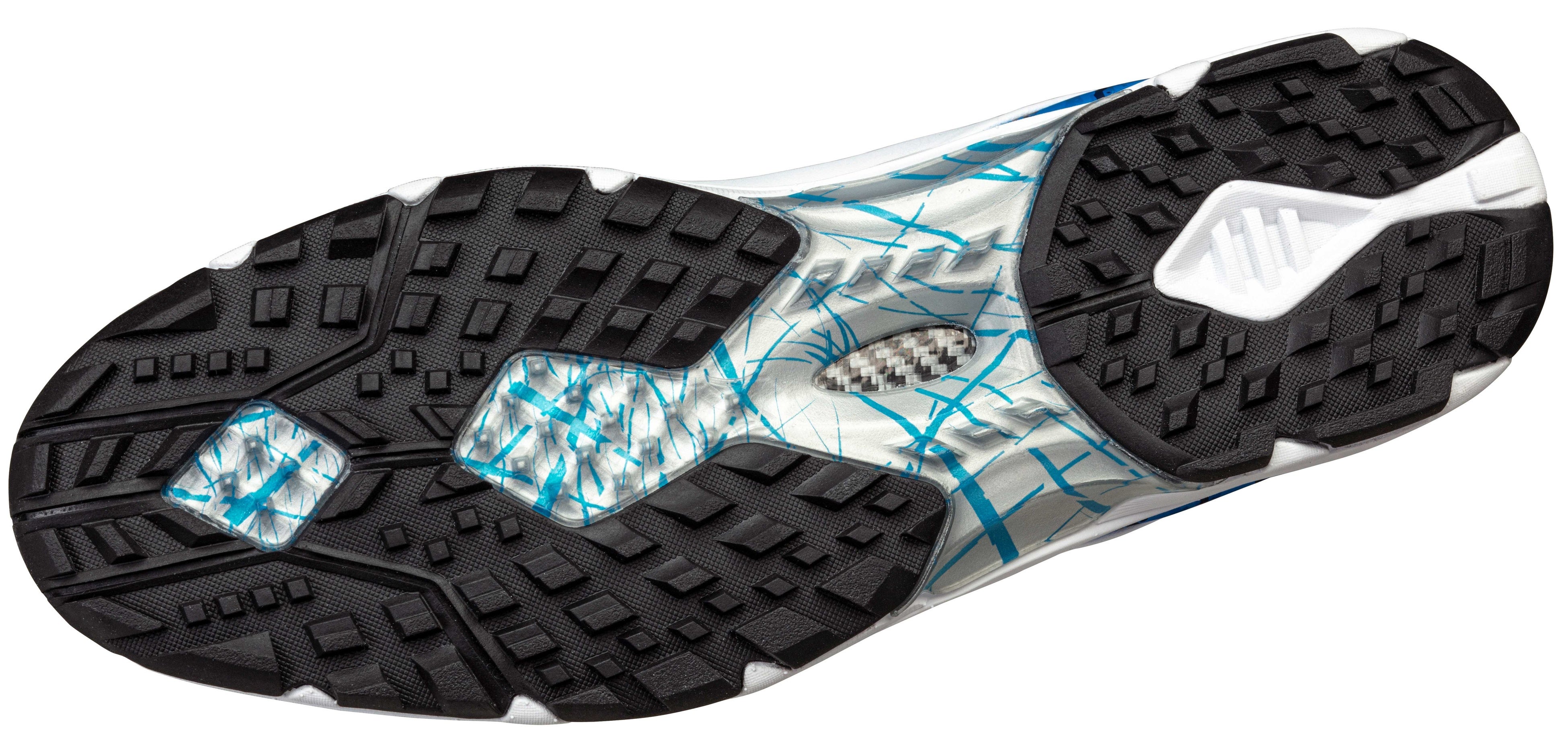 ゴルフシューズは、「少しでも軽く、且つしっかり芝にグリップするシューズを履きたい」というゴルファーのニーズに応え昨年7月に上市した、スパイクレスシューズ『ゼロ・スパイク バイター ライト(SHG150)』のビビットな限定カラー(SHG15L)3色(BL:青、LY:ライムイエロー・SV:シルバー)を8月6日に発売します。価格はオープンです。同商品は、約270g(26.5㎝ 片足)と裸足感覚の軽さを徹底追求し、シャンク部分には超軽量・高強度で反発性能に優れた『KaRVOTM(カルヴォ)』を搭載。軽量シューズでありながらしっかりとした剛性を確保しています。アウトソールには、ブリヂストンのタイヤテクノロジーを応用した突起形状を継続使用することで安定したグリップ力と、スパイクレス本来のメリット(歩きやすさ・疲れにくさ)を両立した軽量スパイクレスシューズです。