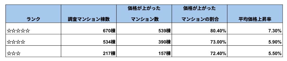 一方で、評価が星4つ、3つと下がるにつれて、価格上昇数の割合も上昇率も低下しています。