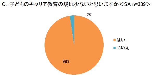 一方で、「子どものキャリア教育の場は少ないと思いますか<SA>」では、9割以上が「はい」と回答しました。高等学校での金融教育が始まるなどキャリア教育に力を入れ始めているものの、社会で必要不可欠な生きる力を広く学べる環境や機会の提供が、これまで以上に求められていることが分かります。