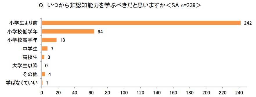 また、「いつから非認知能力を学ぶべきだと思いますか<SA>」では、「小学生より前」(242)が圧倒的に多く、7割を超えました。次に多い「小学校低学年」(64)を含めると、9割以上となり、幼少期の早い段階からの学びを望んでいることが分かります。