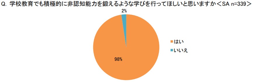 「学校教育でも積極的に非認知能力を鍛えるような学びを行ってほしいと思いますか<SA>」という問では、9割以上が「はい」と回答しました。子どもたちが多くの時間を過ごし、友達や先生など多くの人との関わりがある学校で、非認知能力についても鍛えてほしいと望んでいることが分かります。