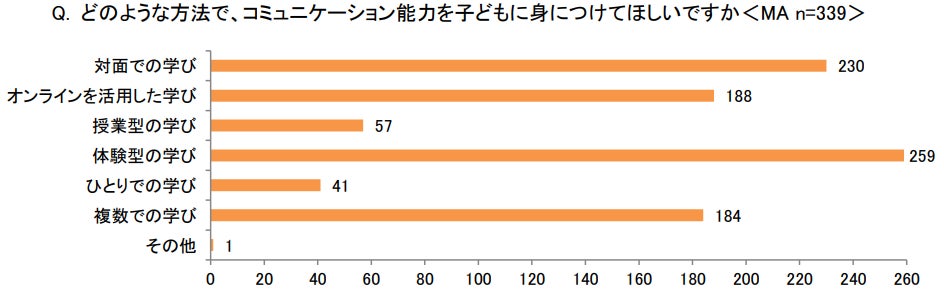 また、「どのような方法で、コミュニケーション能力を子どもに身につけてほしいですか<MA>」では、約8割が「体験型の学び」(259)と回答し最も多く、次いで「対面での学び」(230)が続きました。人と関わりながら、実践型の学びや双方向な学びを通して、コミュニケーション能力を身につけてほしいことが見てとれます。