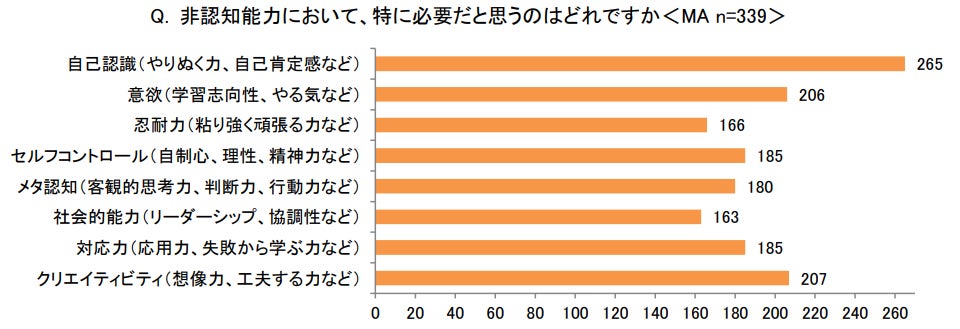 「非認知能力において、特に必要だと思うのはどれですか<MA>」という問では、「自己認識(やりぬく力、自己肯定感など)」(265)が最多となり、次いで、「クリエイティビティ(想像力、工夫する力など)」(207)、「意欲(学習志向性、やる気など)」(206)と続きました。一方で各項目における大きな差はなく、多方面から幅広くさまざまな力を身につけてほしいと感じていることが見てとれます。