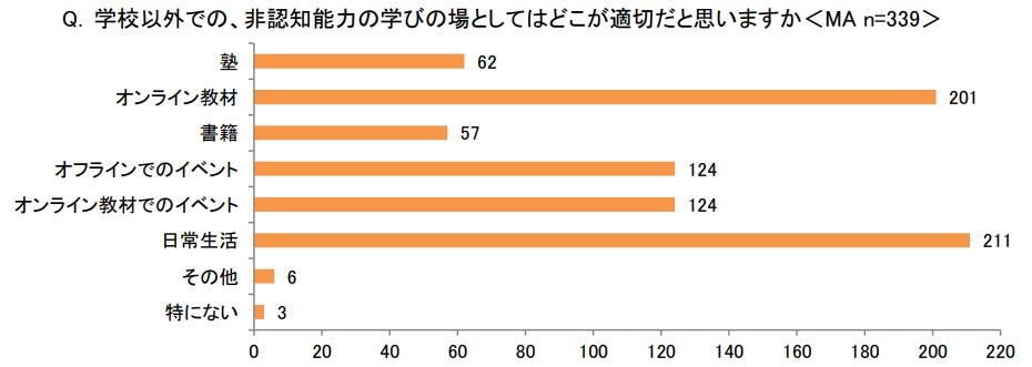 また、「学校以外での、非認知能力の学びの場としてはどこが適切だと思いますか<MA>」では、第1位が「日常生活」(211)、第2位が「オンライン教材」(201)となりました。近年、コロナ禍でのオンライン授業の実施やデジタル教科書の導入などによって、オンラインでの学びが一般的になる中で、非認知能力の習得に関しても、オンライン活用を求めていることが伺えます。