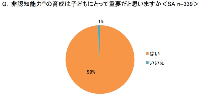 「非認知能力※の育成は子どもにとって重要だと思いますか<SA>」という問について、99%が「はい」と回答し、非認知能力の育成への注目度が非常に高い結果となりました。近年の社会構造の変化や先行き不透明な状況を受け、学力テストや偏差値などでは測れない、生きる力そのものを身につけることへの関心が高まっていることが伺えます。