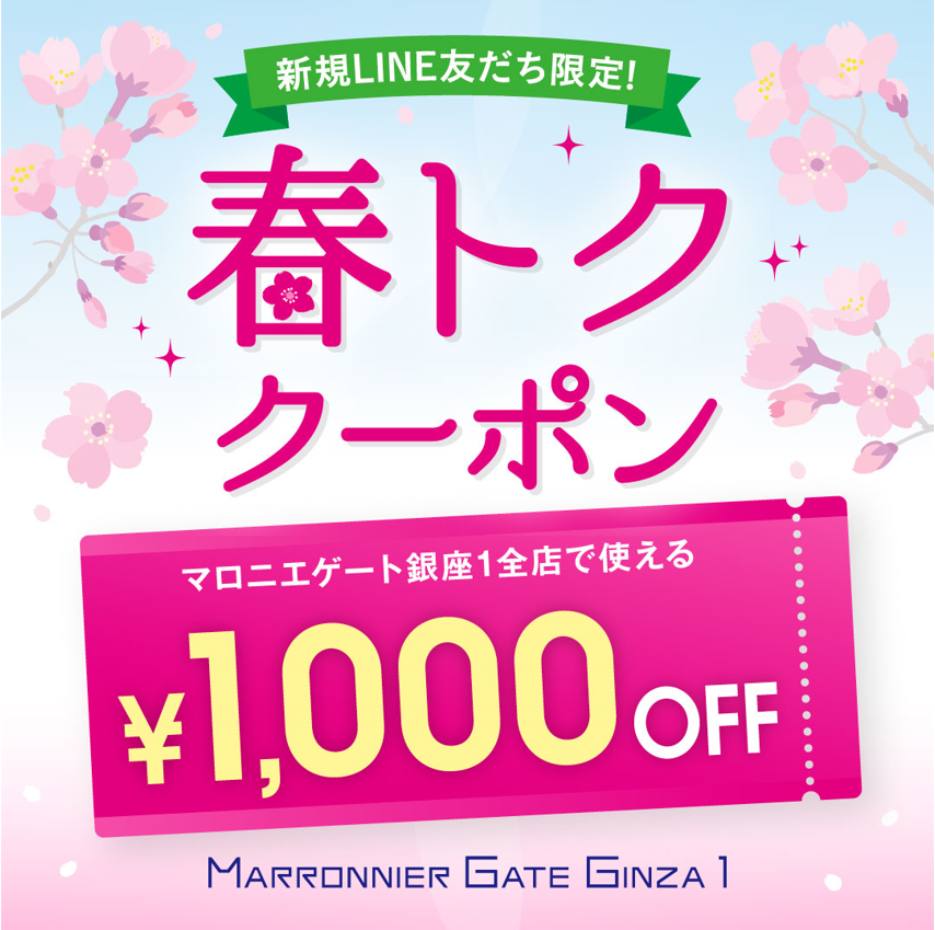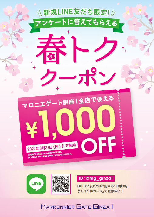 【マロニエゲート銀座1】LINE公式アカウントを友だち追加していただいたお客様の中から、簡単なアンケートに答えていただいた先着8,000名様に税込3,000円以上で使える1,000円クーポンをプレゼント!(MG1全店舗で利用OK)