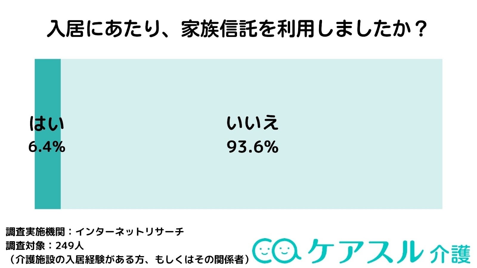 調査の結果、介護施設に入居するにあたり家族信託を利用した方は6.4%でした。なお、「その他」を選択された1名は、「後見人制度」を利用したと回答しております。
