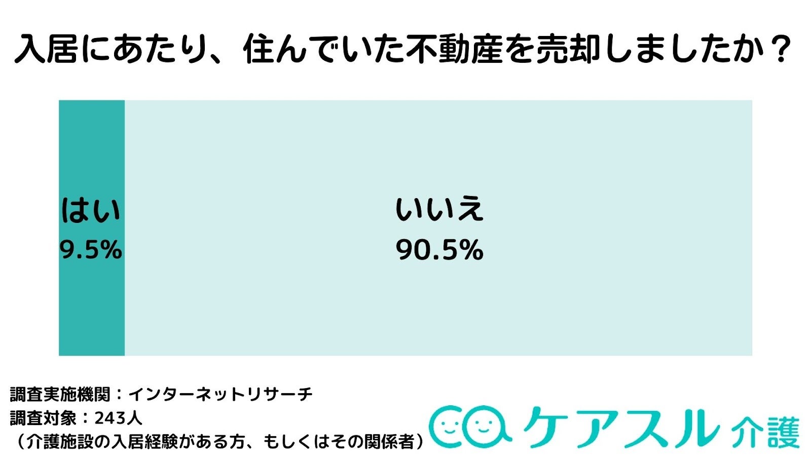 介護施設に入居するにあたり不動産を売却したと回答された方は9.5%という結果となりました。なお、「その他」と回答された7名は「不動産を所有していない・賃貸」であったため、除外しております。