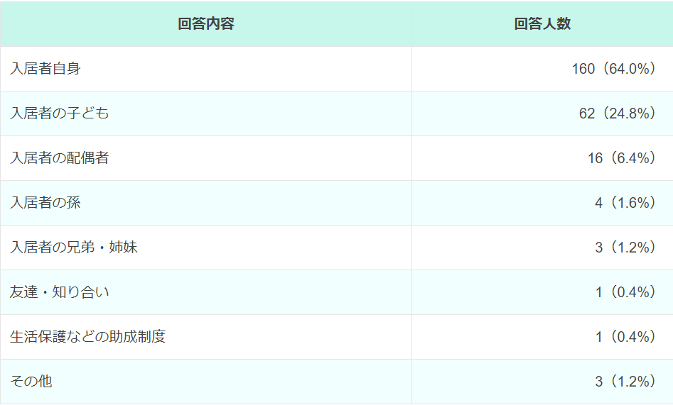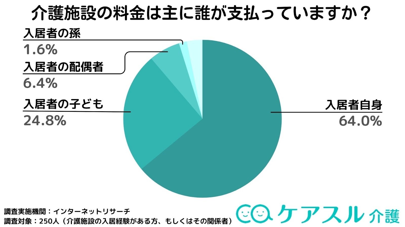 調査の結果、介護施設の費用は「入居者自身」が負担すると回答された方が64.0%で最も多く、次に多いのが「入居者の子ども」の24.8%という結果となりました。なお、支払う人が複数いる場合は、支払う割合が最も多い方を選択して頂いております。