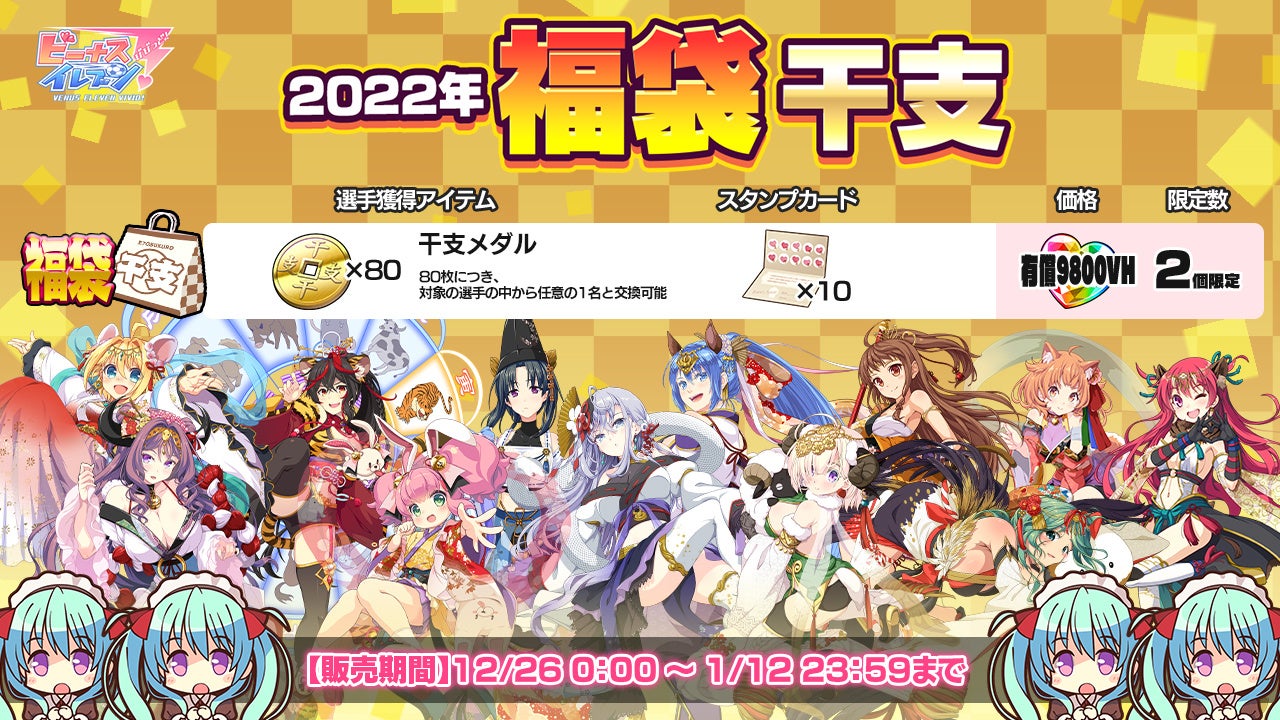 7度目の年末を迎える美少女育成サッカーSLG「ビーナスイレブンびびっど!」が恒例の「年末年始豪華キャンペーン」を開催。好評につき5度目の登場となる「干支スカウト&復刻干支スカウト」や新春恒例のお正月限定パック、新春びびびくじの初開催など年末年始にふさわしいキャンペーンを順次実施します。