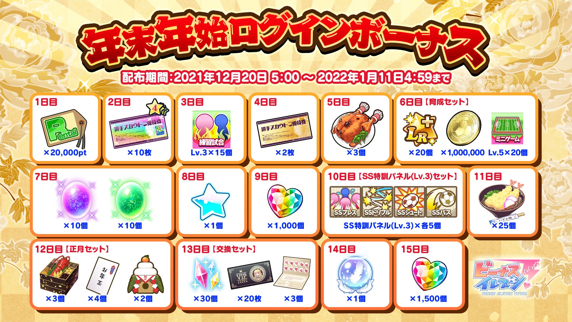 期間中全てログインすれば各種お得なアイテムセットやSSビーナスの輝石が手に入る、お正月にふさわしい豪華なログインボーナスとなっています。