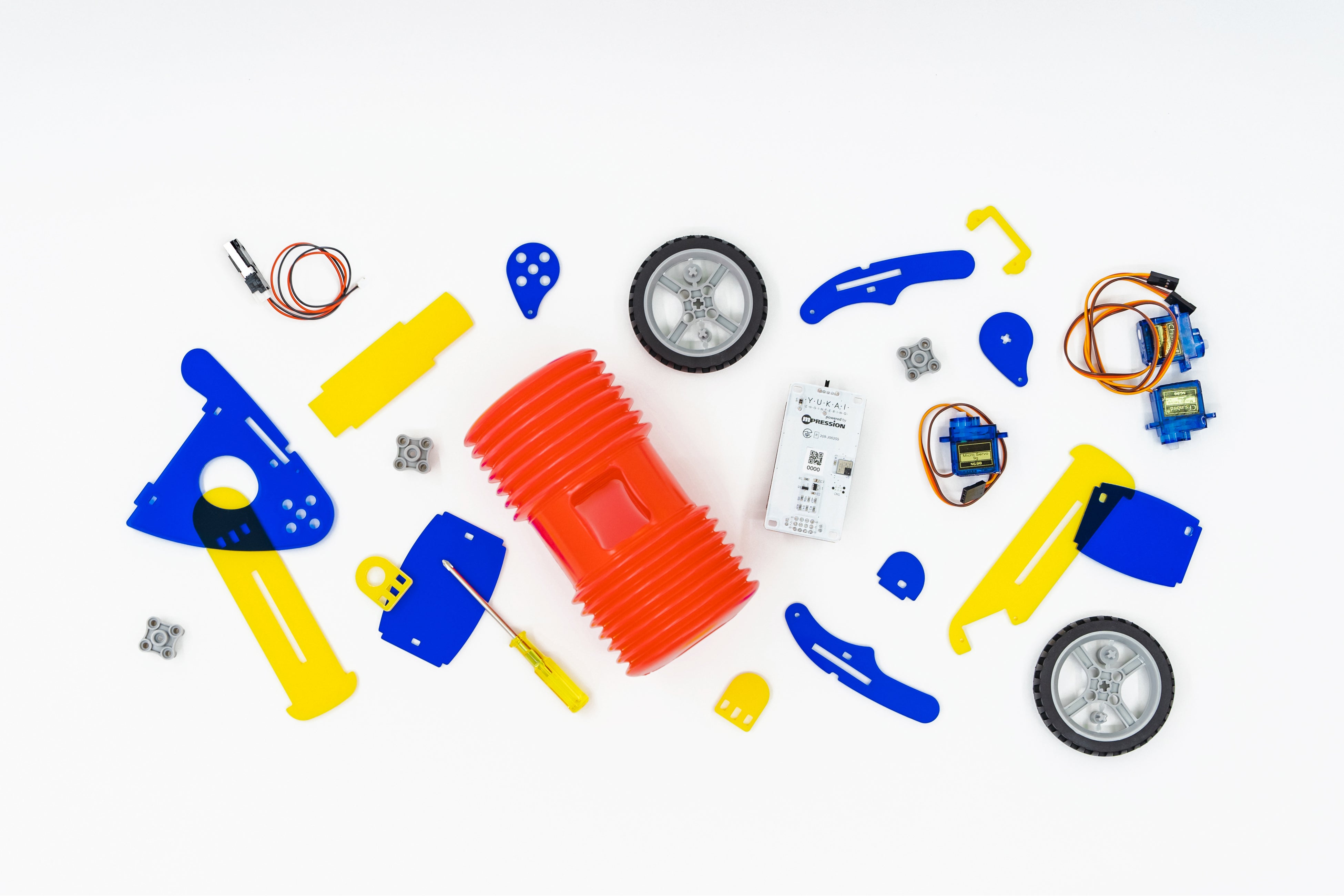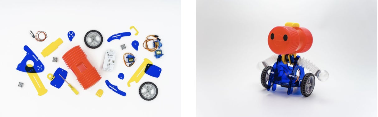 「ユカイなピコハンロボットキット」は、アクリル板やタイヤ、特徴的なプラスチック製ハンマー、モーターなどのパーツから成る組み立て式のロボットキットで、組み立てたロボットはタブレットやスマートフォン画面のリモコンで簡単に操縦したり、プログラミングをして遊ぶことができます。