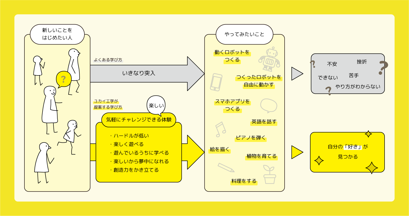 ユカイ工学は、そんな思いに気軽にチャレンジできる体験を提案します。「楽しい」をすべての学びの入り口に、自分の「好き」を見つけよう。