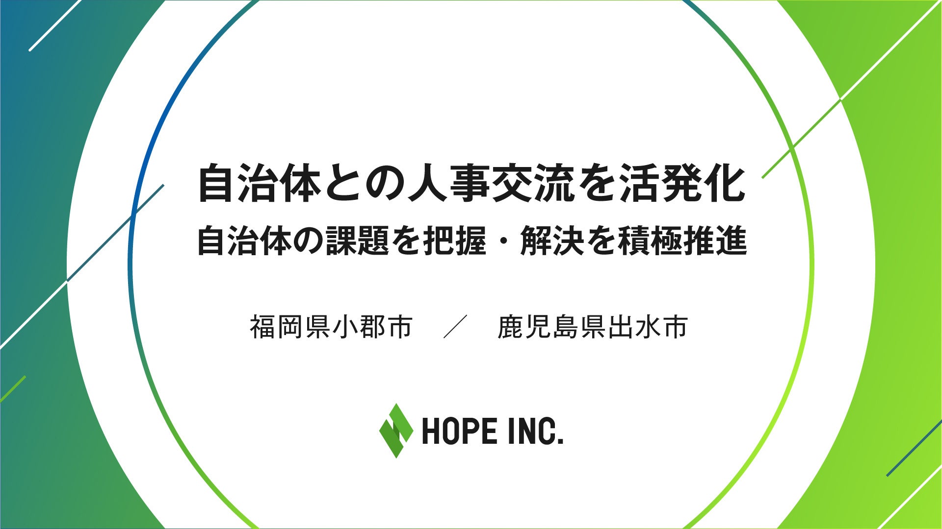 自治体に特化したサービスを展開する株式会社ホープ(本社:福岡県福岡市、代表取締役社長兼CEO:時津孝康、証券コード:6195、以下「当社」)は、本日より1年間、自治体との人事交流を実施いたしますので、お知らせいたします。当社グループは、福岡県小郡市役所と「交流派遣研修に関する協定書」を、また鹿児島県出水市役所と「出水市役所職員の人事交流に関する協定書」を締結し、それぞれの協定内容に従い人事交流を開始しております。