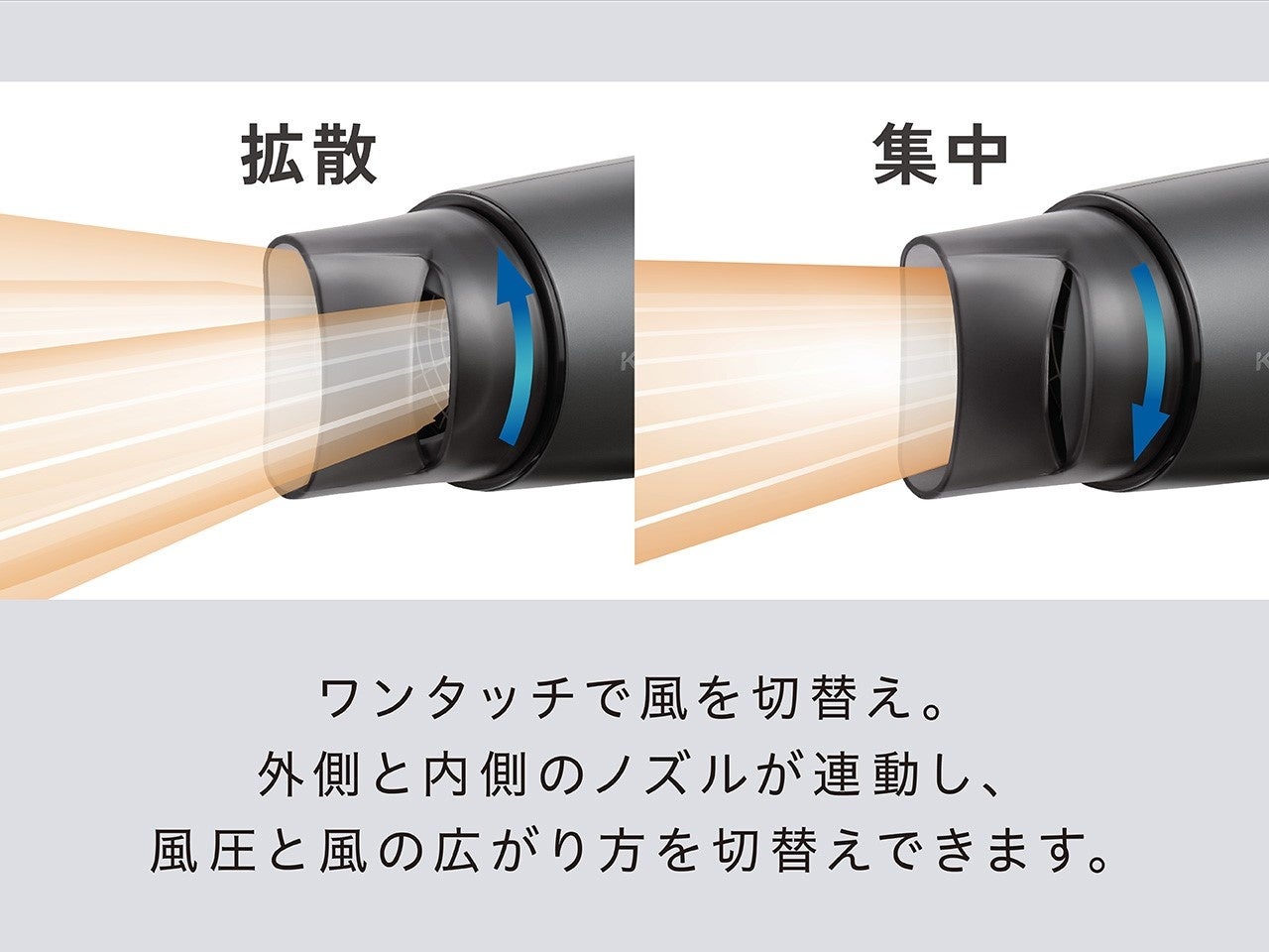 ・大風量2.0㎥/分、ハイパワー1200Wで速乾。※ノズル無しの時、測定方法は、JIS C 9613に基づく。