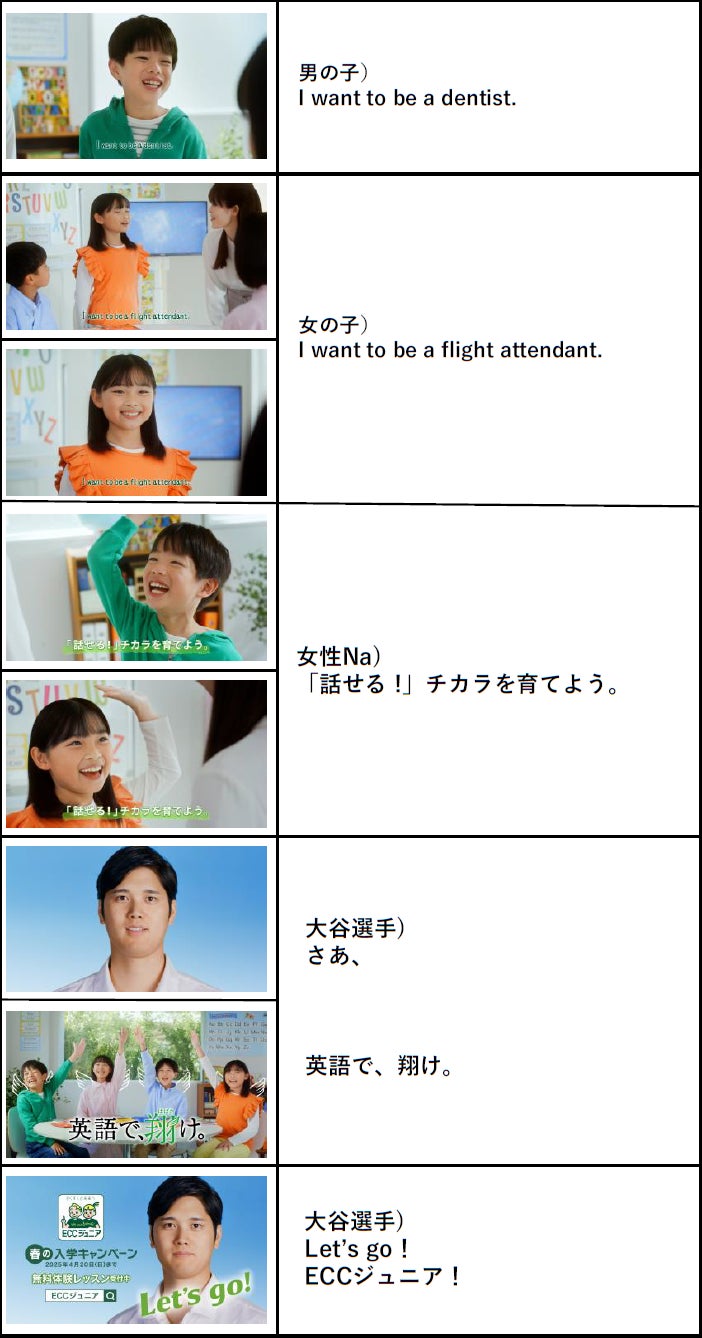 新TVCMでは、「楽しい」「好き」という気持ちを育むことで、子どもたちの自ら学ぶ力と自信を引き出し、英語で話す力が自然と身についていくECCジュニアのレッスンの特長を表現するとともに、夢に向かって翔(はばた)こうとしている子どもたちを大谷翔平選手が後押しする内容になっています。